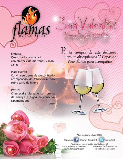 Restaurante Flamas te invita a su promocion de San Valentin para este año 2013, pasa un rato hermoso con tu pareja o con tus amigos...