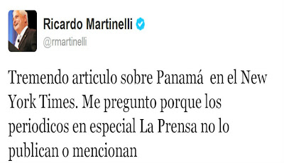 El presidente de la República, Ricardo Martinelli escribió la noche del domingo en su cuenta de Twitter "tremendo artículo sobre Panamá en el New York Times. Me pregunto porque los periódicos en especial La Prensa no lo publican o mencionan"...